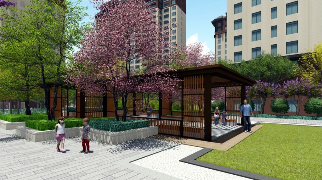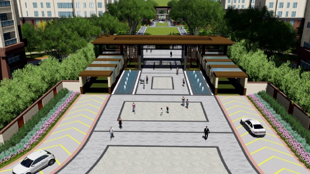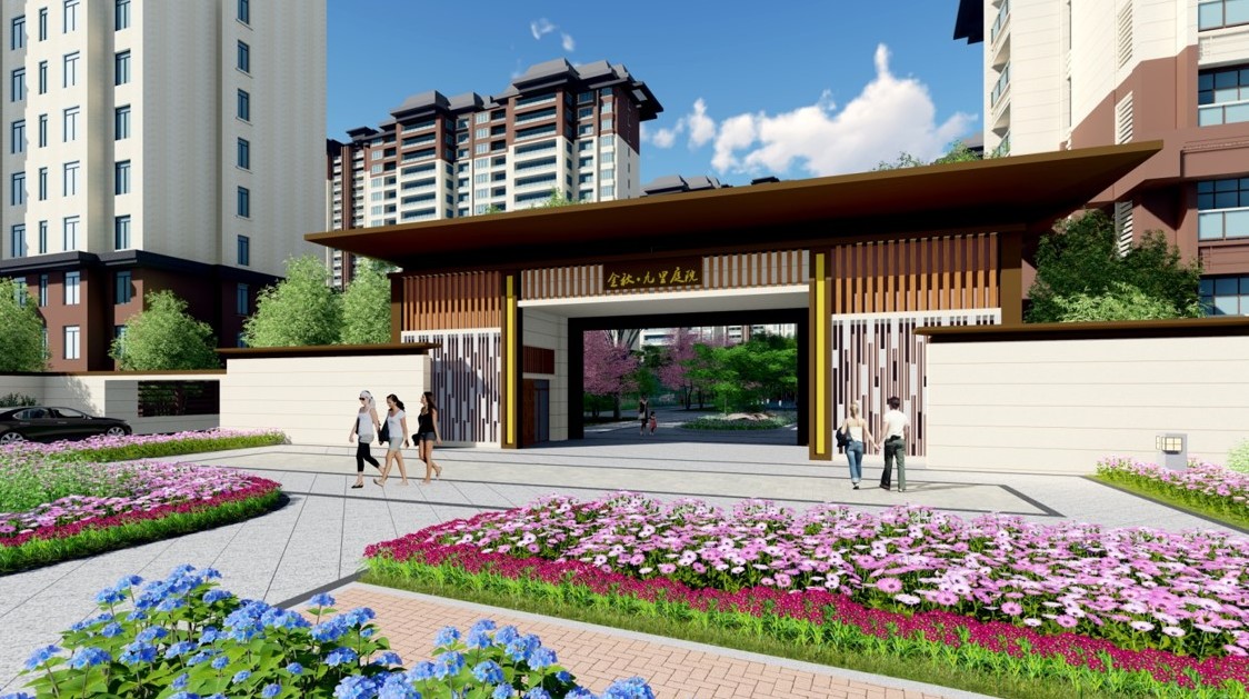 設(shè)計理念:新中式風(fēng)格,大門造型采用方頂,平直線條來打造,凸顯其莊嚴(yán)、肅穆、大氣之感,基于小區(qū)的功能以及使用人群的屬性,打造運動空間、休閑會客空間、靜謐空間。