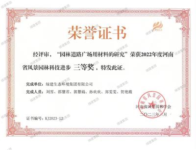 園林道路廣場用材料的研究榮獲2022年度河南省風(fēng)景園林科技進(jìn)步獎三等獎